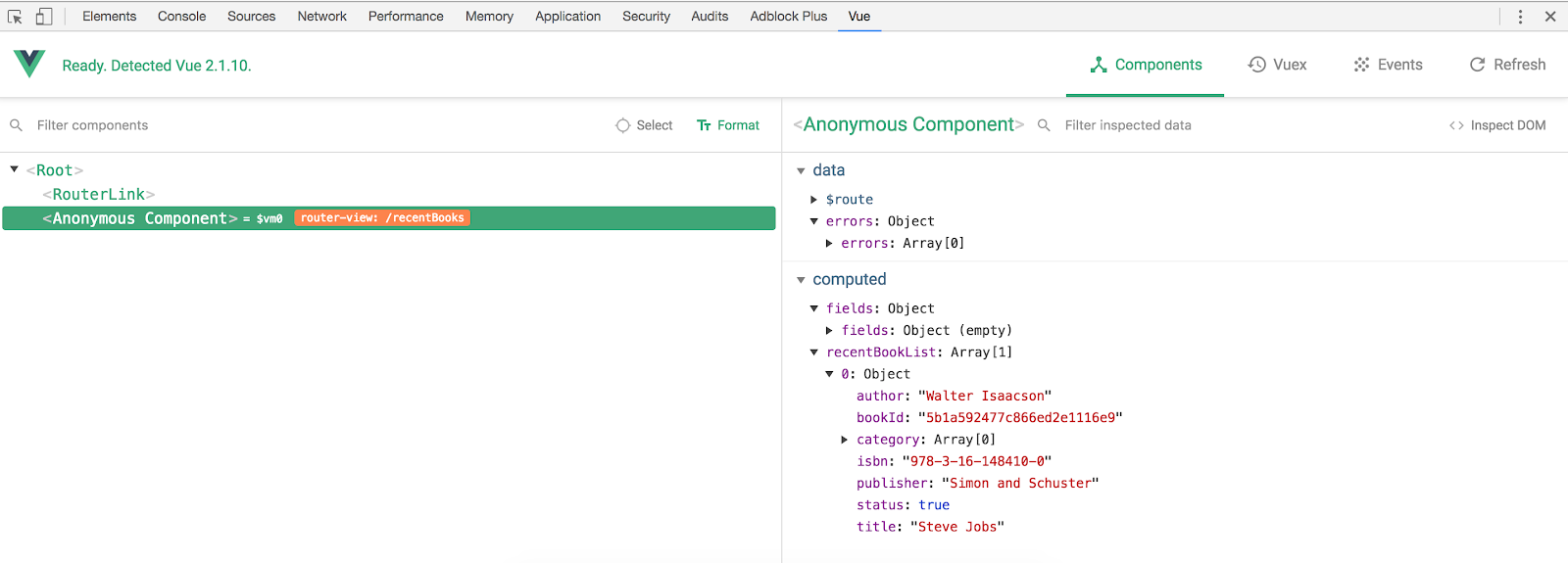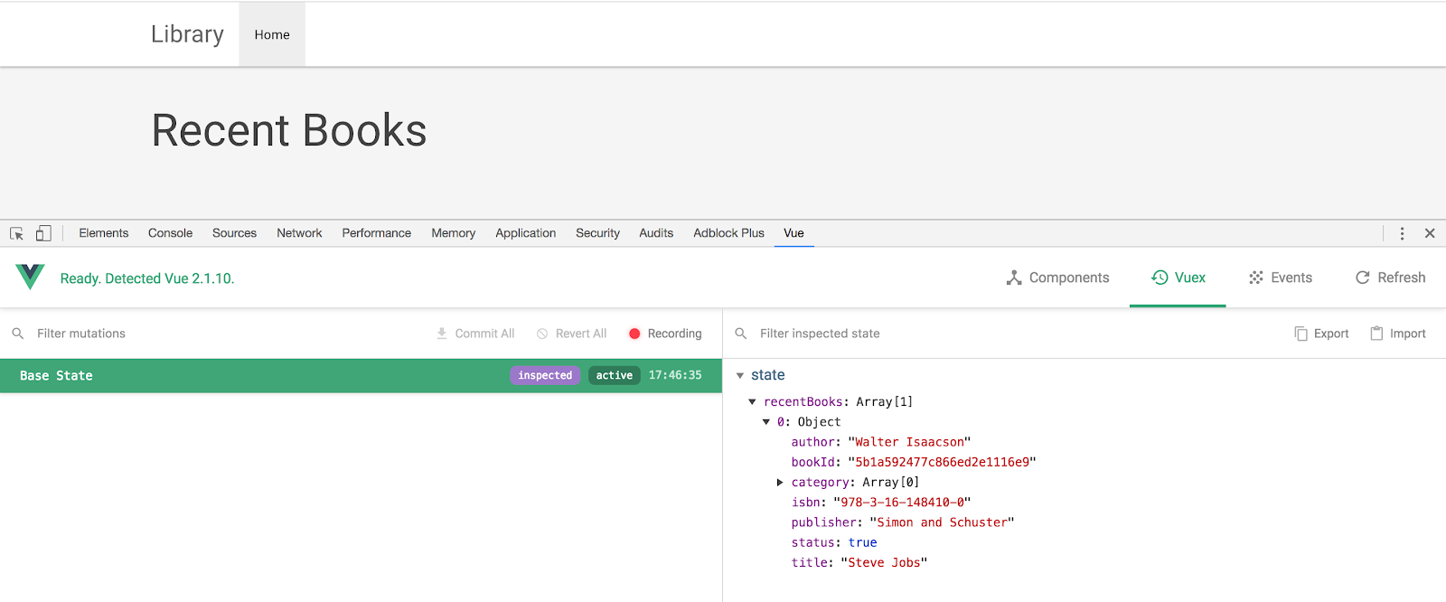 Now run and see it in Vue Chrome Dev tool if the recentBooks state is updated from backend.
